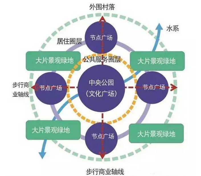 田園城市是一種理想化的城市形態,在它的指導下,我們可以構建一個理想化的旅游小城鎮模型,但是具體的設計方案要受制于地形地貌、城市現狀甚至于文化風俗等現實條件。大體上可以概括為:宜人的城市尺度;以文化廣場、夜間演藝為核心;商業軸線連接公共中心與居住區;大片的景觀綠地穿插于城市之中;步行街區連接中心與節點廣場;有富于活力的濱水岸線;城市外圍是合院式的村落。